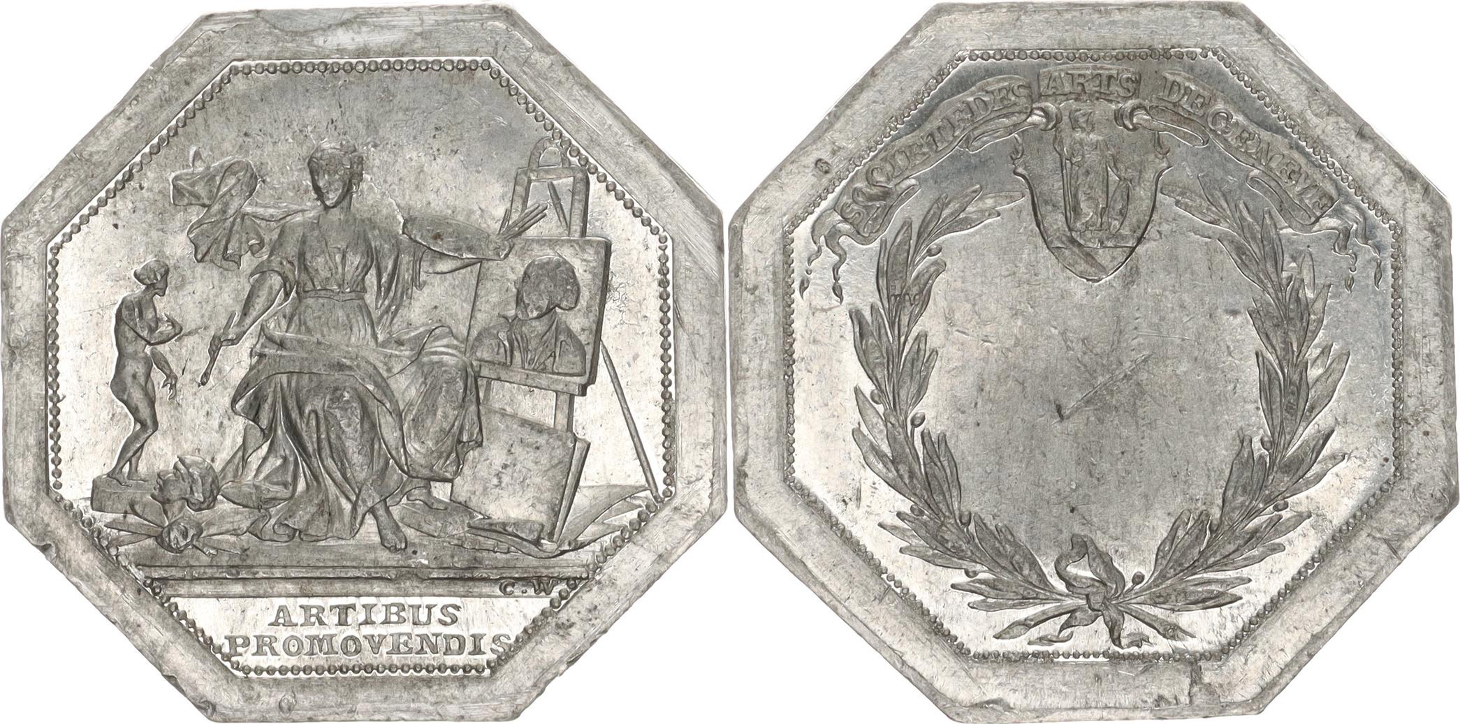 Genéve (Ženeva) - Podporovat umění, malíř u stojanu / nahoře votevřeném věnci městský erb a stuha s nápisem Sn 8-mi úhelník36 mm