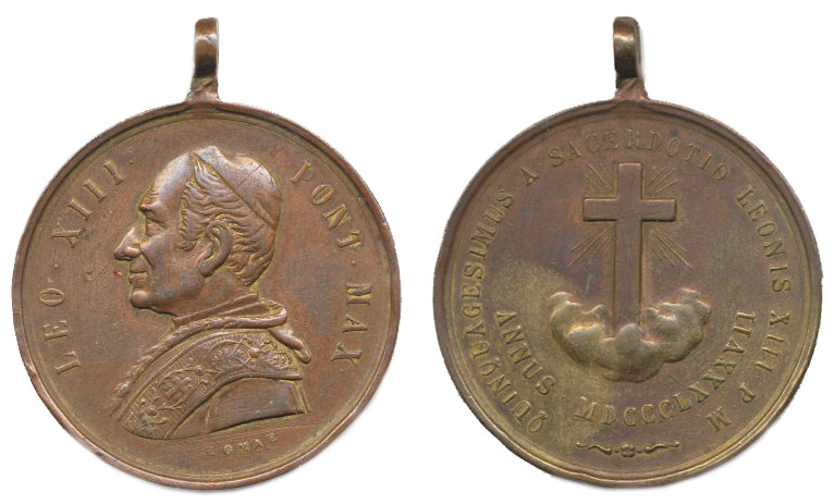 Leo XIII., medaile k 50. výr. kněžství 1837-1887, A: Poprsí papeže zleva, opis / R: Zářící kříž vystupuje z oblaků, opissign.: ROMAE bronz 30,5 mm kolmé ouško