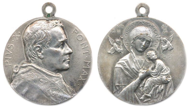 Pius X., Medaile pontifikální, mariánská. A: Poprsí papeže zprava sign.: KISSING / R: Obraz Panny Marie Matky dobré rady z Genazzana alpaka 40 mm kolmé ouško