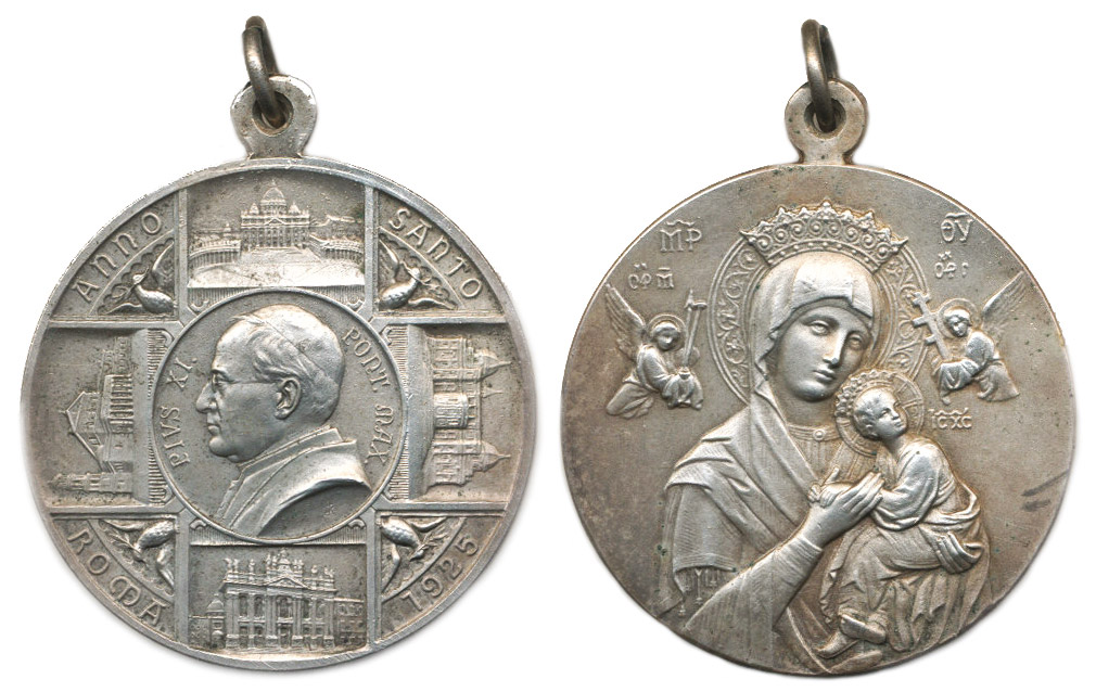 Pius XI., medaile na Svatý rok 1925, A: Poprsí papeže a 4 římské baziliky (sign.: HK) / R: Obraz Matky Ustavičné pomoci z kostelaNejsvětějšího Vykupitele a sv. Alfonse na pahorku Esquilino v Římě alpaka 40 mm podélné ouško