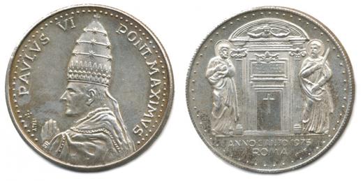 Paulus VI., Medaile na Svatý rok 1975, A: Poprsí papeže v tiáře zleva, opis / R: Svatá brána mezi apoštoly Petrem a Pavlem, nápis sign.: ITALY postř. bronz 35 mm