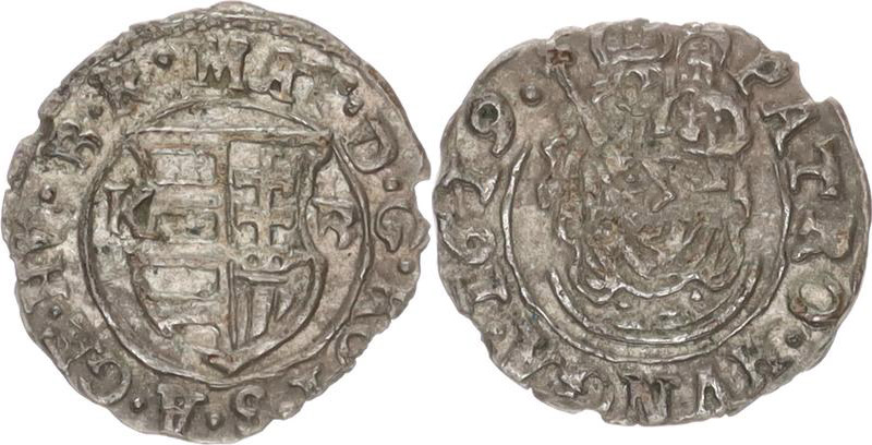 Denár 1619 K-B var.: ve zn. schází spodní oblouček u "B", opis: RO. I. S. A. GE....._neprav. kraj