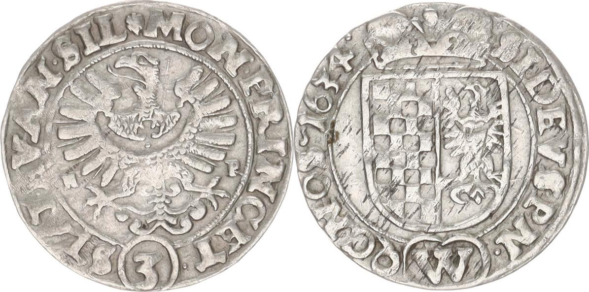 3 kr. 1634 HR/W, Vratislav-Rieger MKČ 1146 var.:(3)STAT . EVAN .SIL , v hrudí orlice tečka (1,707 g)