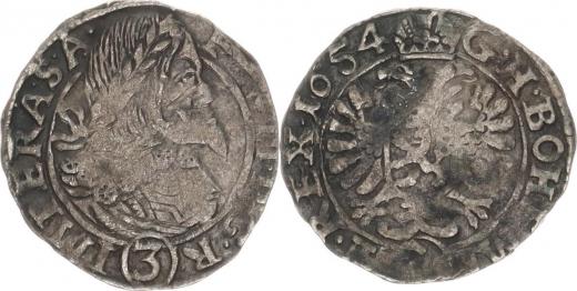 3 kr. 1654, K.Hora-Hackl MKČ 1197 var.: za hlavou výrazná stuha, opis: FER.III.DG.R.()IMPERA.S.A._patina