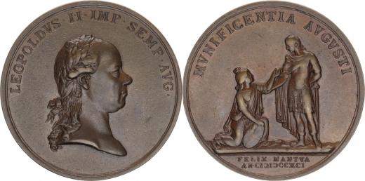 Medaile 1791 - k holdování v Mantově 1791, hlava zprava a opis /před stojícím císařem vpravo klečící patronka Manntovy se štítem,opis sign.: J.Vinazer Cu 44 mm 34,80 gMont. 2250; Nov. N 1b