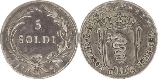 5 Soldi 1784 L-B, pro Lombardsko "R"_mír. nedor.