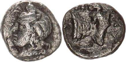 Hemiobol (1/2 obol) 0,309 g, Hlava Atise s frygickou čapkou / pře dní část býka zprava SNG vA 7336