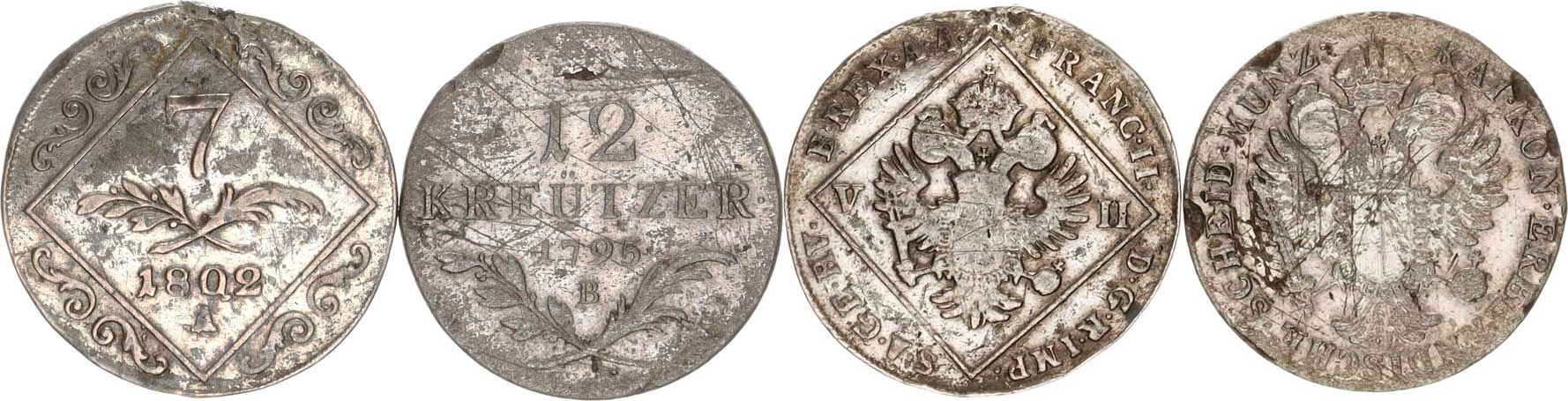 12 kr. 1795 B, vada stř., škr. 7 kr. 1802 A 2 ks, odstr. ouško