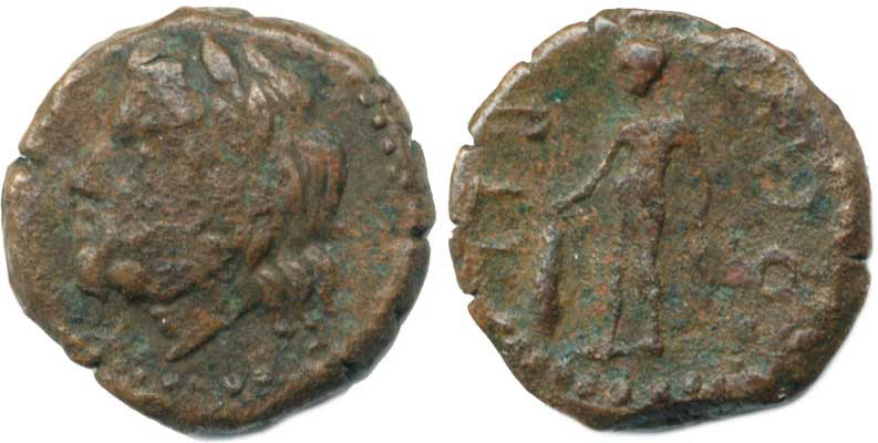 Julius Caesar (100-44 př. Kr.) - Korinthia, AE 17; A: Hlava Dia zleva. R: Stojící Herakles ae opírá