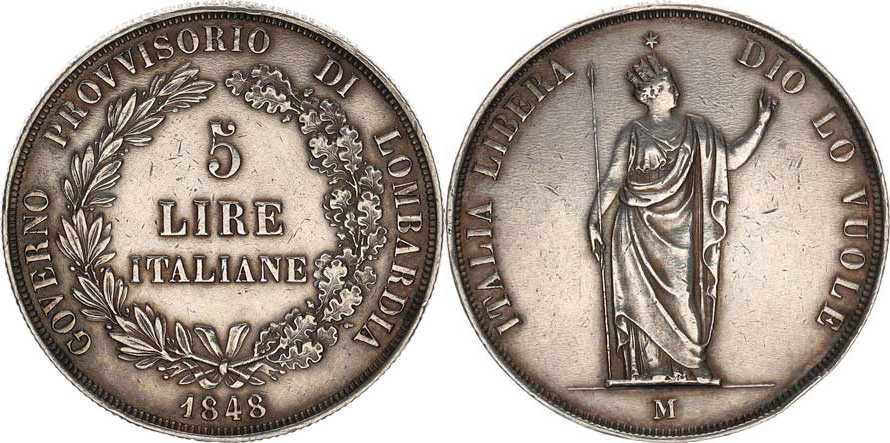 5 Lire 1848 M - krátké konce ratolestí věnce nad letopočtem, hvěz da nad korunou Nov. 39a; Veselý 12 24,985 g