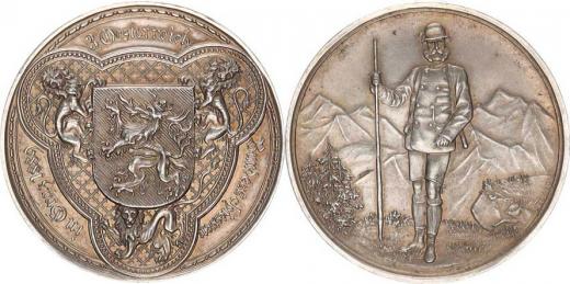 Dvouzlatník 1889 b.zn. - III. rakouské spolkové střelby Graz stojící Fr.Josef I. v horách / štýrský znak, opis, sign. Jauner Ag 36mm 24,349 g "RR"