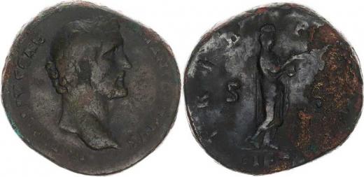 Sestercius, stoj.Pietas zprava mezi S C s paténou, obětuje u oltá ře TRIB P...., v úseči PIETAS / hlava zprava IMP T AELIVS CAE SAR ANTONINVS "RR" (26,631 g), na rev. část.koroze