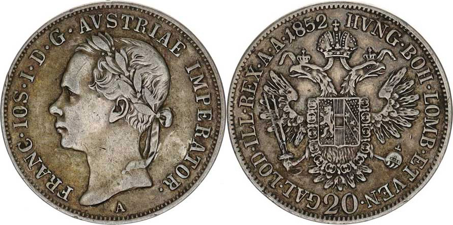 František Josef I.(1848-1918), 20 kr. 1852 A - hlava vlevo "R"