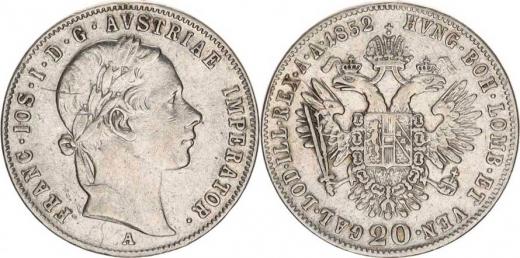 František Josef I.(1848-1918), 20 kr. 1852 A - hlava vpravo, dr. rys., tém.