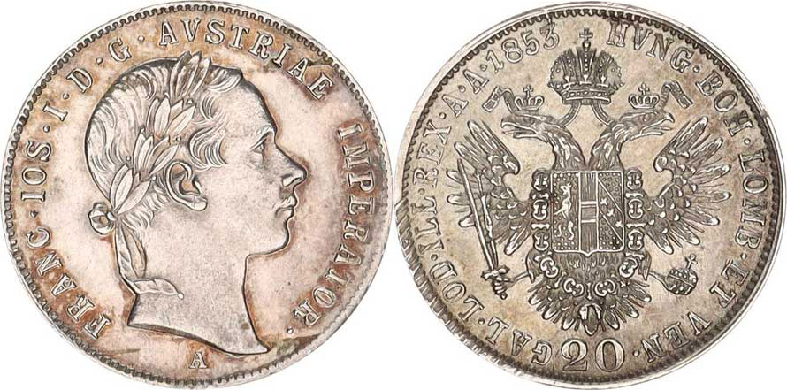 František Josef I.(1848-1918), 20 kr. 1853 A, vada stř. na hr.
