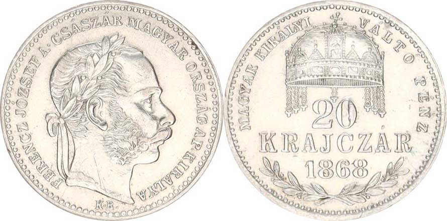 František Josef I.(1848-1918), 20 kr. 1868 KB - MAGYAR KIRÁLYI "R"