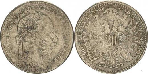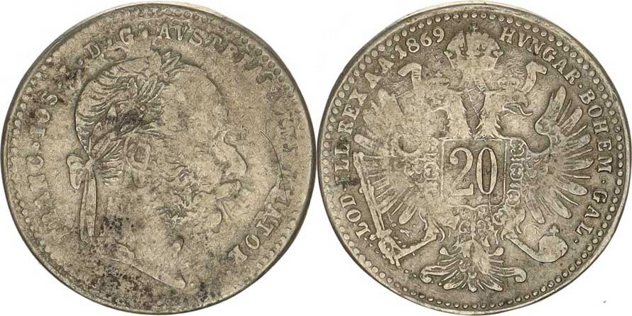 20 kr. 1869 b.zn. - mosaz (Moravec uvádí: nezaručený kus) "RR" 2,204