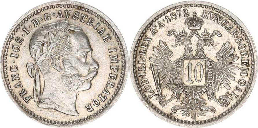 František Josef I.(1848-1918), 10 kr. 1872 b.zn.