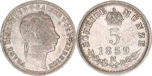 František Josef I.(1848-1918), 5 kr. 1859 M "R", tém.
