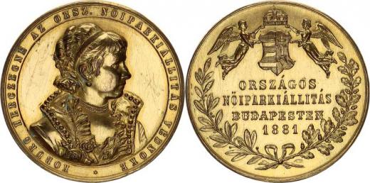 Uhry - Luisa, (vévodkyně Sasko-Coburg-Ghota), patronka výstavy, b usta zprava / Výstava ženských řemesel v Budapešti 1881, 4-řádk. maďar. nápis pod korunovaným erbem podlož. dubovou a vavřín. větv ičkou autor: Scharff Wurzbach 1425; Loehr 57. zlacený bro
