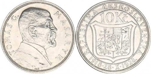 Údobí let 1918-1938, 10 Kč 1928 TGM "sbírkový stav", tém.