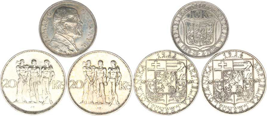 20 Kč 1933, 1934; +10 Kč 1928 - TGM 3 ks