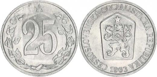 25 hal. 1963 - chyboražba, kolem nominálu "25" prosvítá rv. stran a štítu znaku, Av. a Rav. mírně pootočen 1,416 g