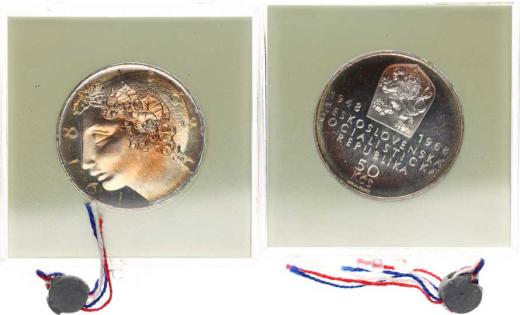 50 Kčs 1968 - 50. výr. republiky, poprvé použtá čtvercová etue zapečetěna keramickou plombou