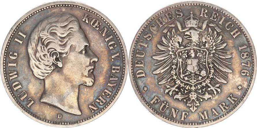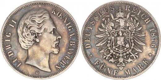 Bavorsko, Ludwig II. (1864-1886), 5 Mark 1876 D KM 502, tém.
