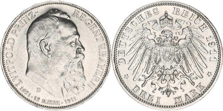 Bavorsko, princ Luitpold (1886-1912), 3 Mark 1911 D - 90. výr. narození KM 998