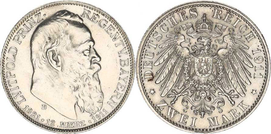 Bavorsko, princ Luitpold (1886-1912), 2 Mark 1911 D - 90. výr. narození KM 997