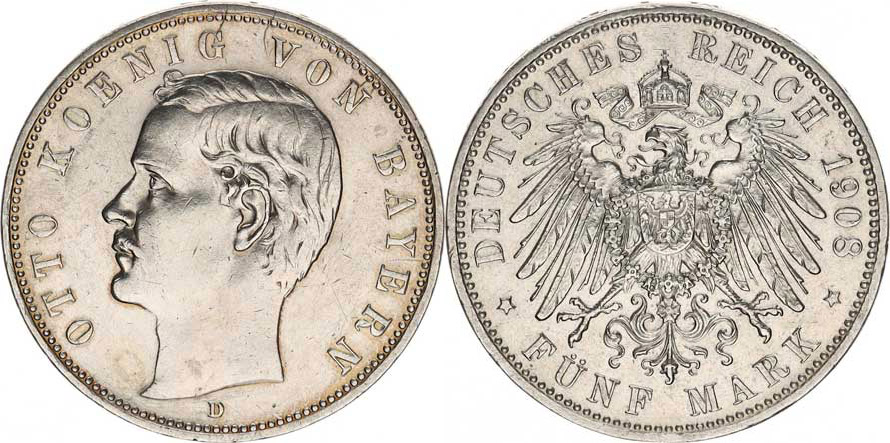 Bavorsko, Otto (1886-1913), 5 Mark 1908 D KM 512