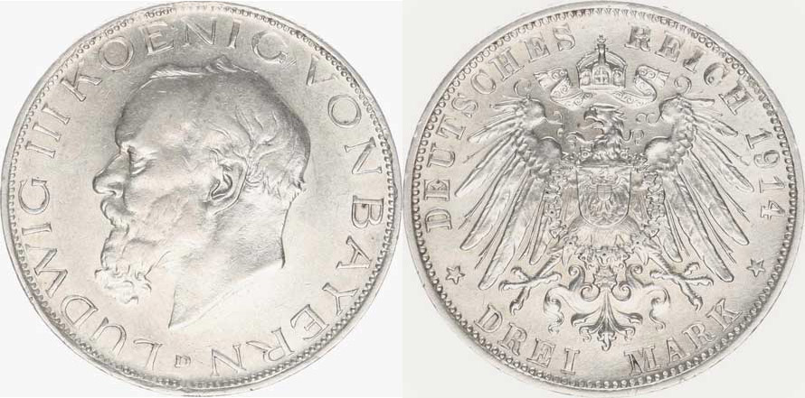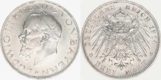 Bavorsko, Ludwig III. (1913-1918), 3 Mark 1914 D KM 1005