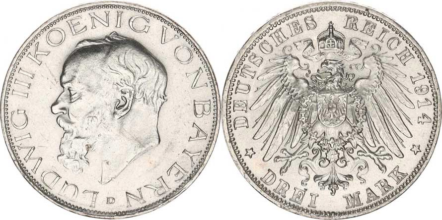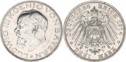 Bavorsko, Ludwig III. (1913-1918), 3 Mark 1914 D KM 1005 "excelentní stav"