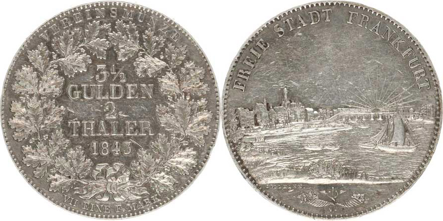 Frankfurt, 2 Tolar = 3 1/2 Gulden 1843, pohled na přístav KM 326 "R"