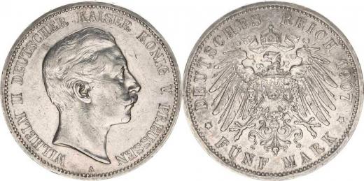 Prusko, Wilhelm II. (1888-1918), 5 Mark 1907 A KM 523, nep. rys.