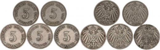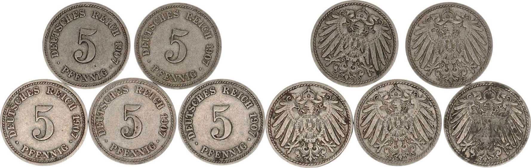 5 Pfennig 1907 D, E, F, G, J 5 ks