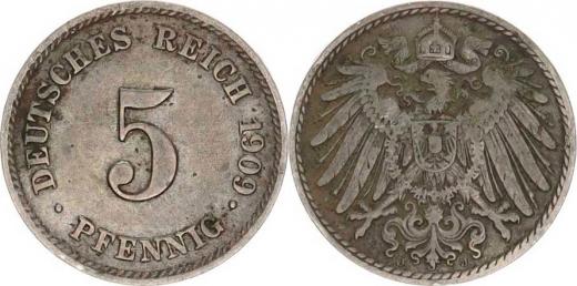 Německo, drobné ražby císařství, 5 Pfennig 1909 J "R"