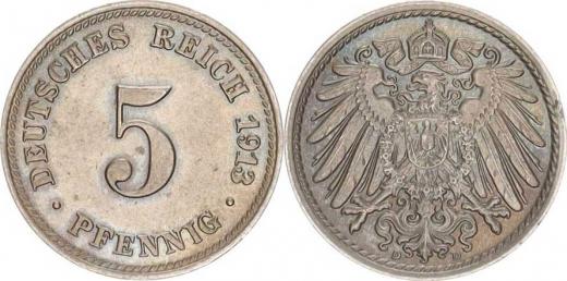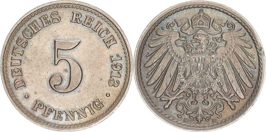 Německo, drobné ražby císařství, 5 Pfennig 1913 D