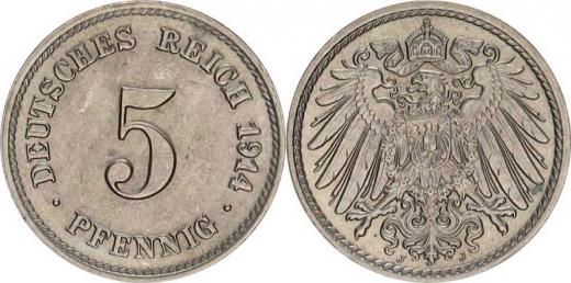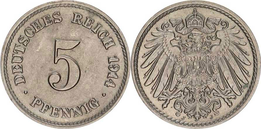 Německo, drobné ražby císařství, 5 Pfennig 1914 J