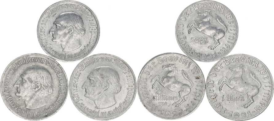 Westfahlen - 2 Millionen Mark 1923, Stein Al 26 mm J 25 1 Mark 1921 Stein Al 26 mm J 10 50 Pf. 1921 Stein Al 24 mm J 9 3 ks