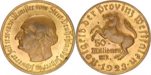 Německo, Nouzová platidla, Westfahlen - 50 Millionen Mark 1923, Stein pozlac. bronz 44,5 m