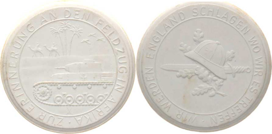 Na památku tažení do Afriky, V popředí styliz. afric. krajiny tan k, opis / na dubové snítce meč a přilba, opis: WIR WERDEN ENGLAND SCHLAGEN WO WIR ES TREFFEN bílý porcelán 49 mm kat. č. 1879 n