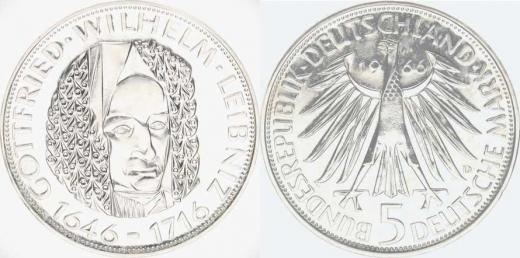 Německo - BRD (1949-), 5 DM 1966 D - Leibniz KM 119,1 "sbírkový stav"