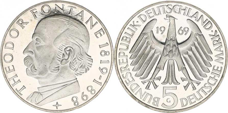 Německo - BRD (1949-), 5 DM 1969 G - Fontane KM 125,1 "R"