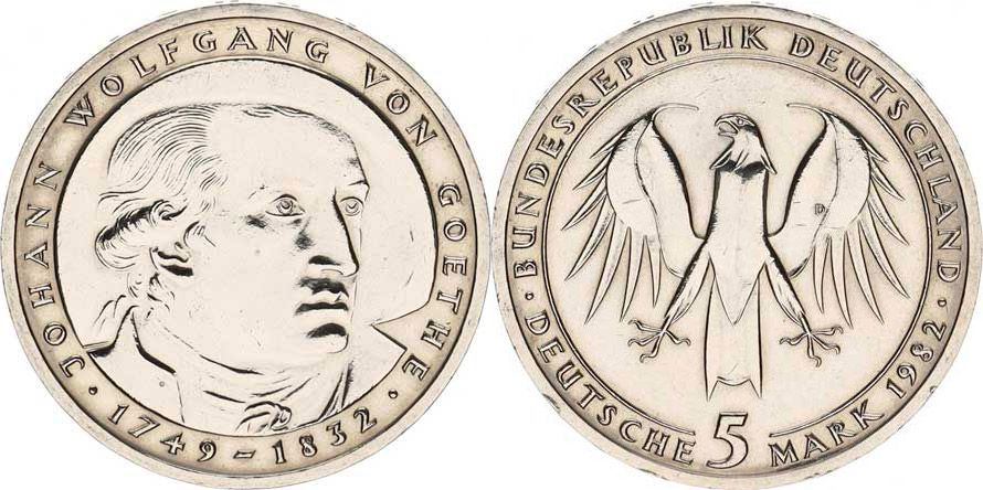 Německo - BRD (1949-), 5 DM 1982 D - Goethe KM 156