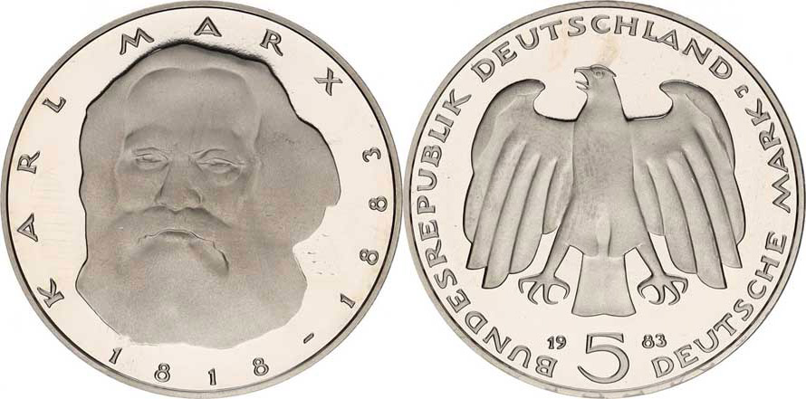 Německo - BRD (1949-), 5 DM 1983 J - Karl Marx KM 158