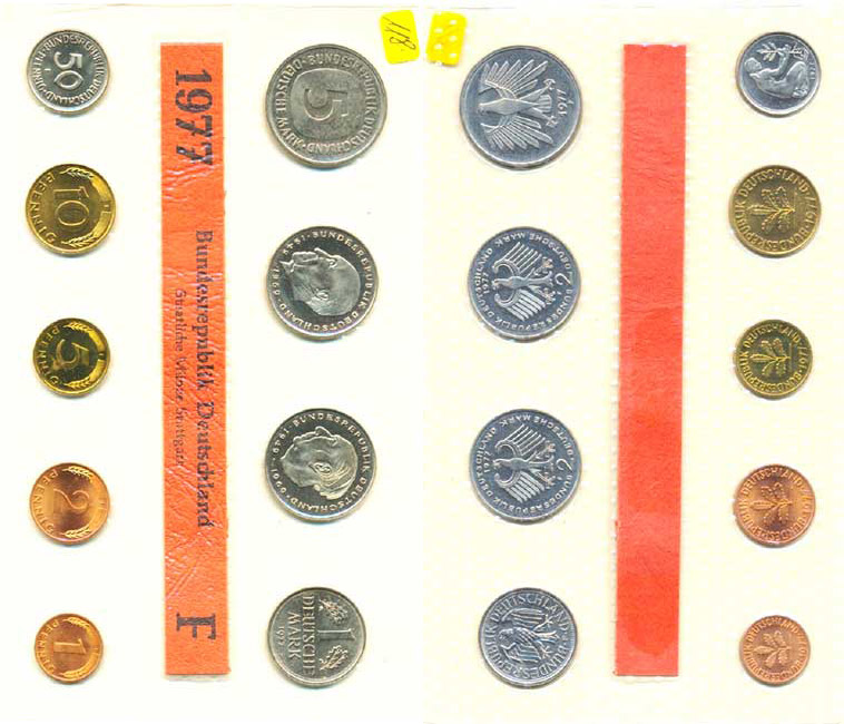 Ročníková sada mincí 1977 minc. F (1, 2, 5, 10, 50 Pf., 1, 5, 2 DM - Adenauer, Heuss) 9 ks zataveno v orig. folii mincovny MS 14