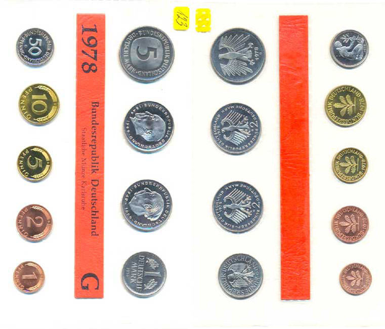 Ročníková sada mincí 1978 minc. G (1, 2, 5, 10, 50 Pf., 1, 5, 2 DM - Adenauer, Heuss) 9 ks zataveno v orig. folii mincovny MS 19