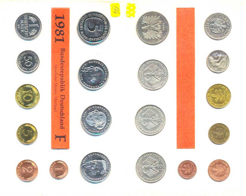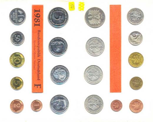 Ročníková sada mincí 1981 minc. F (1, 2, 5, 10, 50 Pf., 1, 5, 2 DM - Adenauer, Heuss, Schumacher) 10 ks zataveno v orig. foli i mincovny MS 30